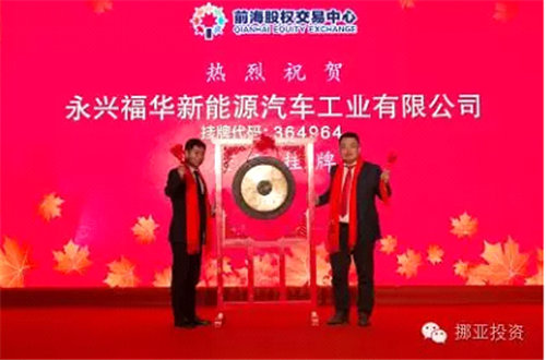 2016年5月25日,由北京挪亚方舟股权投资公司保荐的福华新能源汽车工业有限公司在前海股权交易中心成功挂牌。企业简称:福华新能源汽车。股权代码:364964。