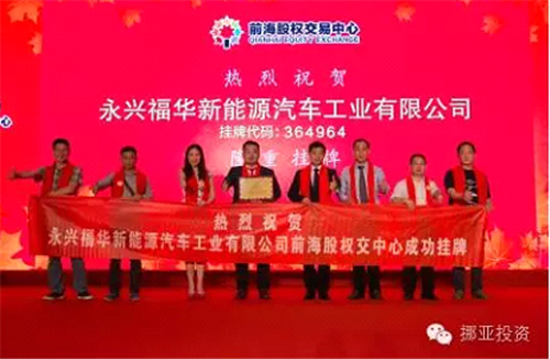 2016年5月25日,由北京挪亚方舟股权投资公司保荐的福华新能源汽车工业有限公司在前海股权交易中心成功挂牌。企业简称:福华新能源汽车。股权代码:364964。
