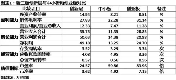 标准一:最近两年连续盈利,且年平均净利润不少于2000万元(以扣除非经常性损益前后孰低者为计算依据,意在防止财务操控);最近两年加权平均净资产收益率平均不低于10%(以扣除非经常性损益前后孰低者为计算依据)。 标准二:最近两年营业收入连续增长,且年均复合增长率不低于50%;最近两年营业收入平均不低于4000万元;股本不少于2000万股。 标准三:最近有成交的60个做市转让日的平均市值不少于6亿元;最近一年年末股东权益不少于5000万元;做市商家数不少于6家;合格投资者不少于50人。(每个标准内所要求的条件必须全部满足) 符合这三个标准的其中一个,并同时满足其它对公司治理、合法合规、财务审计等方面要求的即可以进入创新层。据新三板6月24日公布的文件显示,当前创新层公司共有953家。由于新三板的挂牌公司主要是中小企业,投资者自然会将之与在主板场内交易的中小板、创业板进行比较来评价公司质地。本文依据从万得资讯取得的2015年年报数据,采用整体法(所有股票的相应数据加总计算,区别于单个计算再取平均)从盈利能力、增长能力、经营能力和估值指标四个方面进行了对比分析(如图表1)。