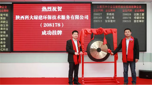 2015年11月18日陕西科大绿建环保技术服务有限公司(股权简称:绿建环保,股权代码:208178) 成功登陆上海股权托管交易中心中小企业股权报价系统。