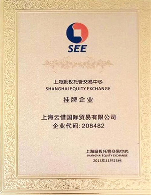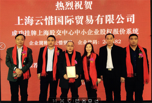 015年12月18日,上海云惜国际贸易有限公司成功登陆上海股权托管交易中心中小企业股权报价系统。股权简称:云惜国际,股权代码:208482。